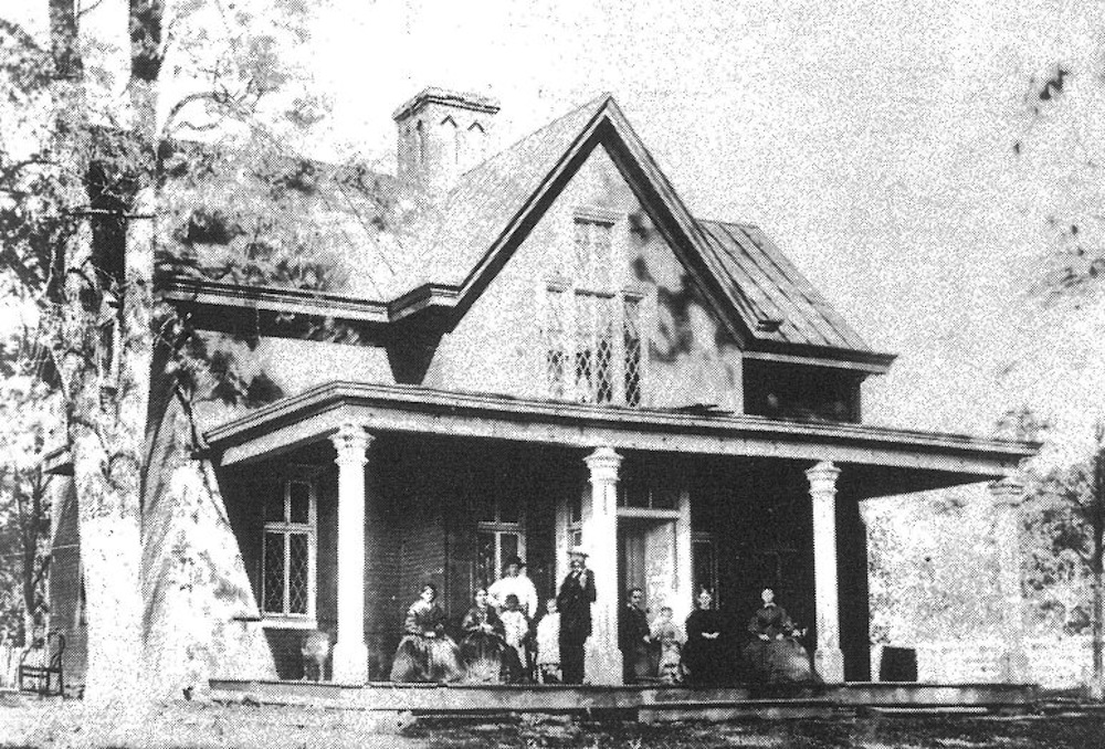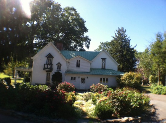The property was completely vacant when we arrived–so we were a little nervous we might be trespassing–but absolutely beautiful, a serene space that could rival any idyllic image we could envision of a nineteenth-century cottage. After a ten-minute stroll along a path leading through the green, fertile grounds–complete with a natural spring and mature willows–we reached the house: a modest Gothic Revival cottage. It is a romantic house with white-painted brick, porches, balconies, and windows varying in size and shape.