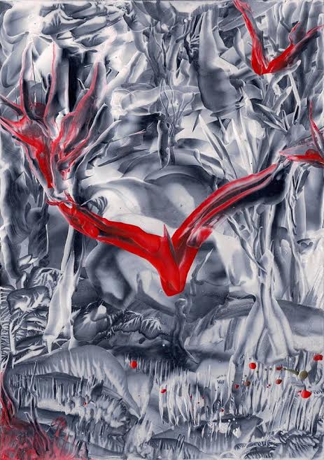 “Forest of Red Birds” by Mia Avramut, wax on paper, 5.8 x 8.2 in. Originally published at Rkvry Quarterly Literary Journal 12.4 (Fall 2015).