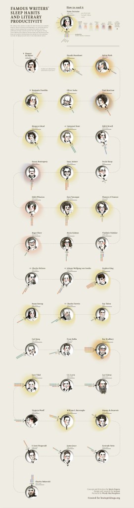 Since sleep has been on my mind recently, I wanted to simply share two more graphs; each depicts sleep habits and literary / professional production. Looking at these charts and the individual, sometimes “quirky” routines, of authors, inventors, and thinkers, but it is a fun way to get everyone thinking about their own sleep habits.