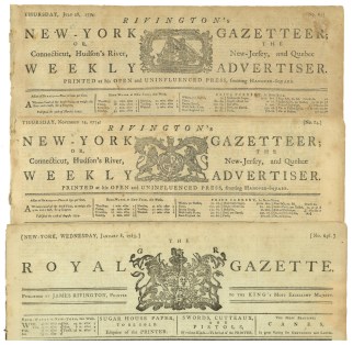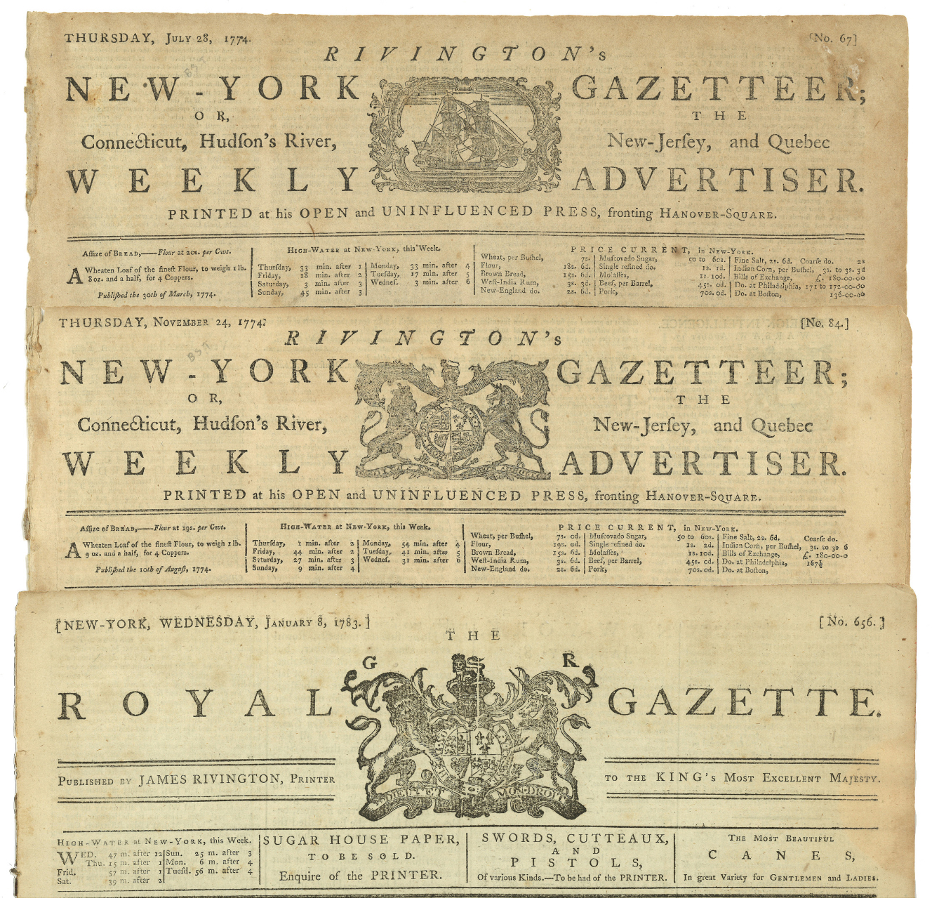 Rivington’s home and printing office were twice attacked and destroyed by a mob of Sons of Liberty in May and November of 1775. Following the second attack, Rivington sailed to England, returning to New York in 1777 with an appointment as the king’s printer. Upon his return, he re-launched his newspaper with the new title, Rivington’s New York Loyal Gazette (and, later, the Royal Gazette). He continued to print this newspaper until which it kept until issue No. 746 on November 19, 1783. The newspaper finally removed “Royal” from its title and survived 12 more issues under the name Rivington’s New-York Gazette.
