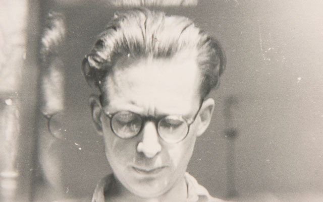 Andrzej Wróblewski, [Self-Portrait with Glass Reflection], undated. Black and white photograph, 5.2 x 8.4 cm. Archive of the Artist’s Heirs. © Andrzej Wróblewski Foundation.
