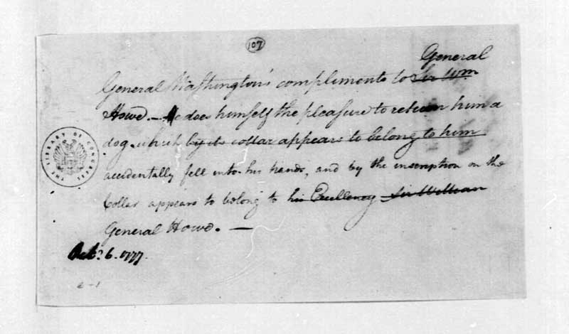 General Washington’s compliments to General Howe, does himself the pleasure to return [to] him a Dog, which accidentally fell into his hands, and by the inscription on the Collar appears to belong to General Howe.