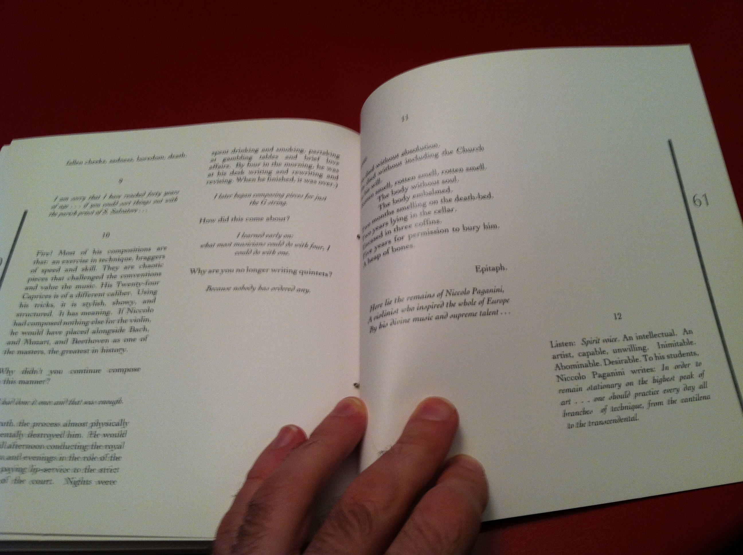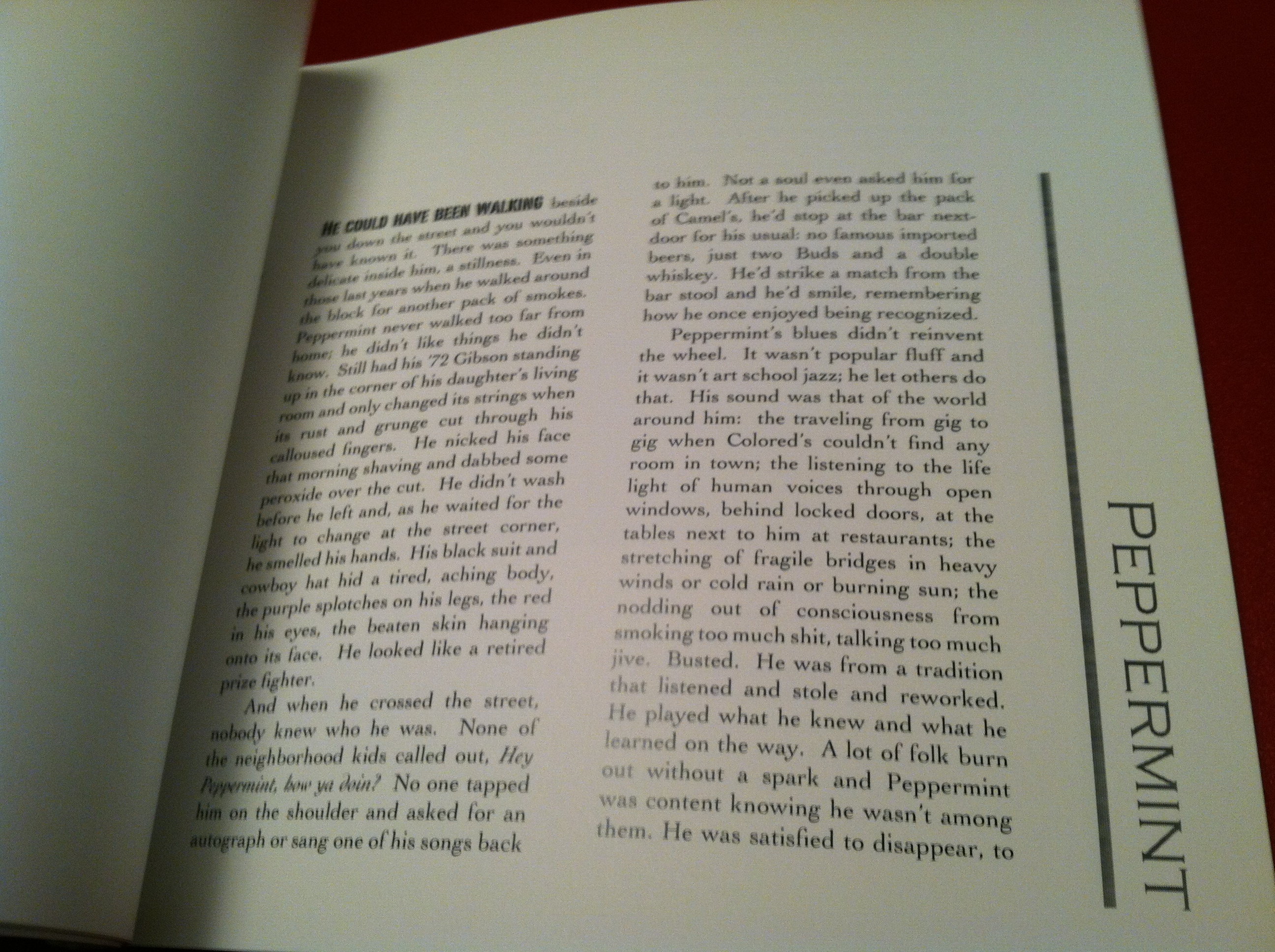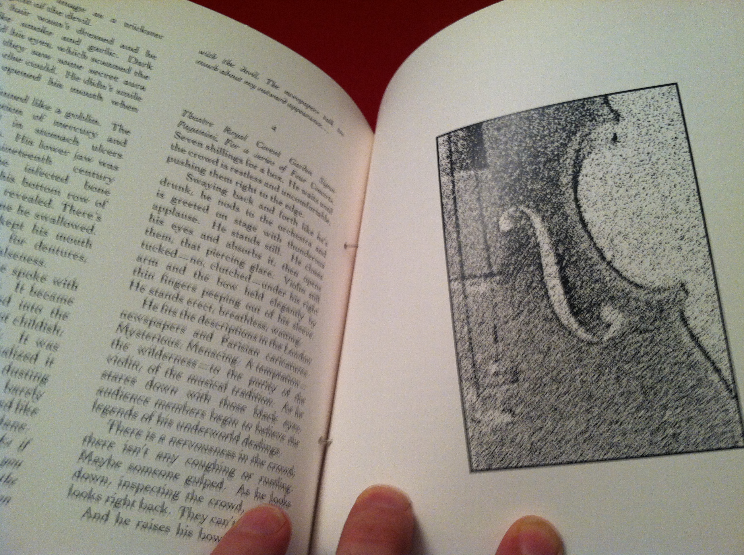 Remember to Breathe collects four creative essays and six original pieces of artwork. Part of my M.A. thesis in the Creative Writing and Publishing Arts program at the University of Baltimore, the work contains essay fragments that simultaneously deconstruct in narrative and form. They “attempt” to tell the stories of blues artist Peppermint Harris, the production of the musical Hair, the breakdown and mythology of classical composer Niccolo Paganini, and my own experiences as audience member of the opera Lady Macbeth of the Mtsensk District to reveal the work itself as the unworking of the artist. The book cover is printed on vellum and bound by violin and guitar strings. 67 pages.